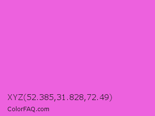 XYZ 52.385,31.828,72.49 Color is a light magenta color and the nearest color is Light Deep Pink #ff5ccd. Hex code #ed61de and RGB value is rgb(237,97,222). In RGB color space, this color is composed of 93% red, 38% green, 87% blue, In CMYK color space, this color is composed of 0% cyan, 59% magenta, 6% yellow , 7% black , In HSL color space, this color has a hue angle of 306° , 80% saturation and 65% lightness.