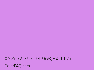 XYZ 52.397,38.968,84.117 Color is a light purple color and the nearest color is Bright Lilac #d891ef. Hex code #d78bec and RGB value is rgb(215,139,236). In RGB color space, this color is composed of 84% red, 55% green, 93% blue, In CMYK color space, this color is composed of 9% cyan, 41% magenta, 0% yellow , 7% black , In HSL color space, this color has a hue angle of 287° , 72% saturation and 74% lightness.