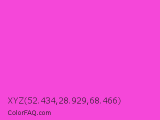 XYZ 52.434,28.929,68.466 Color is a light magenta color and the nearest color is Purple Pizzazz #fe4eda. Hex code #f547d9 and RGB value is rgb(245,71,217). In RGB color space, this color is composed of 96% red, 28% green, 85% blue, In CMYK color space, this color is composed of 0% cyan, 71% magenta, 11% yellow , 4% black , In HSL color space, this color has a hue angle of 310° , 90% saturation and 62% lightness.