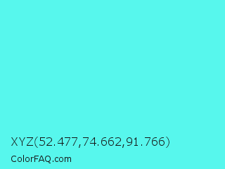 XYZ 52.477,74.662,91.766 Color is a light cyan color and the nearest color is Turquoise Blue #6cdae7. Hex code #57f7ed and RGB value is rgb(87,247,237). In RGB color space, this color is composed of 34% red, 97% green, 93% blue, In CMYK color space, this color is composed of 65% cyan, 0% magenta, 4% yellow , 3% black , In HSL color space, this color has a hue angle of 176° , 91% saturation and 65% lightness.