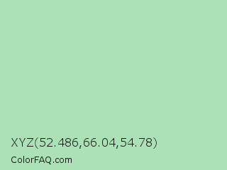 XYZ 52.486,66.04,54.78 Color is a light green color and the nearest color is Chinook #a8e3bd. Hex code #ace1b7 and RGB value is rgb(172,225,183). In RGB color space, this color is composed of 67% red, 88% green, 72% blue, In CMYK color space, this color is composed of 24% cyan, 0% magenta, 19% yellow , 12% black , In HSL color space, this color has a hue angle of 132° , 47% saturation and 78% lightness.