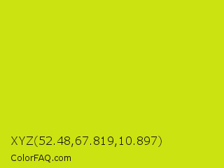XYZ 52.48,67.819,10.897 Color is a normal yellow color and the nearest color is Bitter Lemon #cae00d. Hex code #cce312 and RGB value is rgb(204,227,18). In RGB color space, this color is composed of 80% red, 89% green, 7% blue, In CMYK color space, this color is composed of 10% cyan, 0% magenta, 92% yellow , 11% black , In HSL color space, this color has a hue angle of 67° , 85% saturation and 48% lightness.