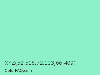 XYZ 52.518,72.113,66.409 Color is a light green color and the nearest color is Riptide #8be6d8. Hex code #8cf0c9 and RGB value is rgb(140,240,201). In RGB color space, this color is composed of 55% red, 94% green, 79% blue, In CMYK color space, this color is composed of 42% cyan, 0% magenta, 16% yellow , 6% black , In HSL color space, this color has a hue angle of 157° , 77% saturation and 75% lightness.