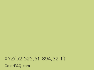 XYZ 52.525,61.894,32.1 Color is a light yellow color and the nearest color is Medium Spring Bud #c9dc87. Hex code #cad587 and RGB value is rgb(202,213,135). In RGB color space, this color is composed of 79% red, 84% green, 53% blue, In CMYK color space, this color is composed of 5% cyan, 0% magenta, 37% yellow , 16% black , In HSL color space, this color has a hue angle of 68° , 48% saturation and 68% lightness.