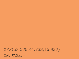 XYZ 52.526,44.733,16.932 Color is a light orange color and the nearest color is Tan Hide #fa9d5a. Hex code #f79d60 and RGB value is rgb(247,157,96). In RGB color space, this color is composed of 97% red, 62% green, 38% blue, In CMYK color space, this color is composed of 0% cyan, 36% magenta, 61% yellow , 3% black , In HSL color space, this color has a hue angle of 24° , 90% saturation and 67% lightness.