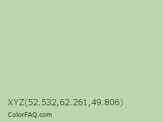XYZ 52.532,62.261,49.806 Color is a light green color and the nearest color is Sprout #c1d7b0. Hex code #bbd7af and RGB value is rgb(187,215,175). In RGB color space, this color is composed of 73% red, 84% green, 69% blue, In CMYK color space, this color is composed of 13% cyan, 0% magenta, 19% yellow , 16% black , In HSL color space, this color has a hue angle of 102° , 33% saturation and 76% lightness.