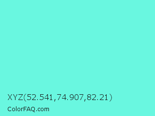 XYZ 52.541,74.907,82.21 Color is a light cyan color and the nearest color is Aquamarine #7fffd4. Hex code #69f7e0 and RGB value is rgb(105,247,224). In RGB color space, this color is composed of 41% red, 97% green, 88% blue, In CMYK color space, this color is composed of 57% cyan, 0% magenta, 9% yellow , 3% black , In HSL color space, this color has a hue angle of 170° , 90% saturation and 69% lightness.
