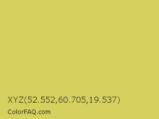 XYZ 52.552,60.705,19.537 Color is a normal yellow color and the nearest color is Tacha #d6c562. Hex code #d6d15e and RGB value is rgb(214,209,94). In RGB color space, this color is composed of 84% red, 82% green, 37% blue, In CMYK color space, this color is composed of 0% cyan, 2% magenta, 56% yellow , 16% black , In HSL color space, this color has a hue angle of 58° , 59% saturation and 60% lightness.