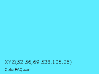 XYZ 52.56,69.538,105.26 Color is a light cyan color and the nearest color is Turquoise Blue #6cdae7. Hex code #5decff and RGB value is rgb(93,236,255). In RGB color space, this color is composed of 36% red, 93% green, 100% blue, In CMYK color space, this color is composed of 64% cyan, 7% magenta, 0% yellow , 0% black , In HSL color space, this color has a hue angle of 187° , 100% saturation and 68% lightness.