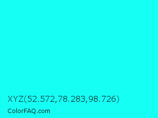 XYZ 52.572,78.283,98.726 Color is a normal cyan color and the nearest color is Loeen #15f2fd. Hex code #16fff5 and RGB value is rgb(22,255,245). In RGB color space, this color is composed of 9% red, 100% green, 96% blue, In CMYK color space, this color is composed of 91% cyan, 0% magenta, 4% yellow , 0% black , In HSL color space, this color has a hue angle of 177° , 100% saturation and 54% lightness.