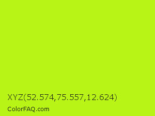 XYZ 52.574,75.557,12.624 Color is a normal lime color and the nearest color is Inch Worm #b0e313. Hex code #b8f517 and RGB value is rgb(184,245,23). In RGB color space, this color is composed of 72% red, 96% green, 9% blue, In CMYK color space, this color is composed of 25% cyan, 0% magenta, 91% yellow , 4% black , In HSL color space, this color has a hue angle of 76° , 92% saturation and 53% lightness.