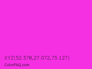 XYZ 52.578,27.072,75.127 Color is a normal magenta color and the nearest color is Razzle Dazzle Rose #ff33cc. Hex code #f530e3 and RGB value is rgb(245,48,227). In RGB color space, this color is composed of 96% red, 19% green, 89% blue, In CMYK color space, this color is composed of 0% cyan, 80% magenta, 7% yellow , 4% black , In HSL color space, this color has a hue angle of 305° , 91% saturation and 57% lightness.