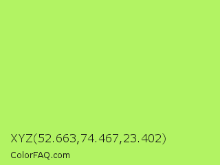 XYZ 52.663,74.467,23.402 Color is a light green color and the nearest color is Inchworm #b2ec5d. Hex code #b2f363 and RGB value is rgb(178,243,99). In RGB color space, this color is composed of 70% red, 95% green, 39% blue, In CMYK color space, this color is composed of 27% cyan, 0% magenta, 59% yellow , 5% black , In HSL color space, this color has a hue angle of 87° , 86% saturation and 67% lightness.