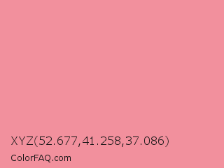 XYZ 52.677,41.258,37.086 Color is a light red color and the nearest color is Sea Pink #ed989e. Hex code #f2909d and RGB value is rgb(242,144,157). In RGB color space, this color is composed of 95% red, 56% green, 62% blue, In CMYK color space, this color is composed of 0% cyan, 40% magenta, 35% yellow , 5% black , In HSL color space, this color has a hue angle of 352° , 79% saturation and 76% lightness.
