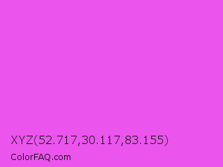 XYZ 52.717,30.117,83.155 Color is a light magenta color and the nearest color is Purple Pizzazz #fe4eda. Hex code #eb54ed and RGB value is rgb(235,84,237). In RGB color space, this color is composed of 92% red, 33% green, 93% blue, In CMYK color space, this color is composed of 1% cyan, 65% magenta, 0% yellow , 7% black , In HSL color space, this color has a hue angle of 299° , 81% saturation and 63% lightness.