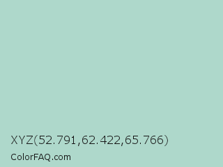 XYZ 52.791,62.422,65.766 Color is a light green color and the nearest color is Jet Stream #b5d2ce. Hex code #aed8cb and RGB value is rgb(174,216,203). In RGB color space, this color is composed of 68% red, 85% green, 80% blue, In CMYK color space, this color is composed of 19% cyan, 0% magenta, 6% yellow , 15% black , In HSL color space, this color has a hue angle of 161° , 35% saturation and 76% lightness.