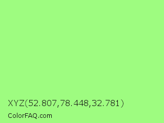 XYZ 52.807,78.448,32.781 Color is a light green color and the nearest color is Pale Green #98fb98. Hex code #9efc80 and RGB value is rgb(158,252,128). In RGB color space, this color is composed of 62% red, 99% green, 50% blue, In CMYK color space, this color is composed of 37% cyan, 0% magenta, 49% yellow , 1% black , In HSL color space, this color has a hue angle of 105° , 95% saturation and 75% lightness.