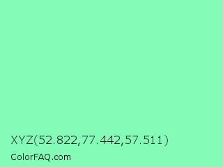 XYZ 52.822,77.442,57.511 Color is a light green color and the nearest color is Aquamarine #7fffd4. Hex code #85fbb8 and RGB value is rgb(133,251,184). In RGB color space, this color is composed of 52% red, 98% green, 72% blue, In CMYK color space, this color is composed of 47% cyan, 0% magenta, 27% yellow , 2% black , In HSL color space, this color has a hue angle of 146° , 94% saturation and 75% lightness.