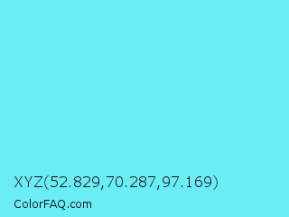XYZ 52.829,70.287,97.169 Color is a light cyan color and the nearest color is Spray #79deec. Hex code #6bedf5 and RGB value is rgb(107,237,245). In RGB color space, this color is composed of 42% red, 93% green, 96% blue, In CMYK color space, this color is composed of 56% cyan, 3% magenta, 0% yellow , 4% black , In HSL color space, this color has a hue angle of 183° , 87% saturation and 69% lightness.