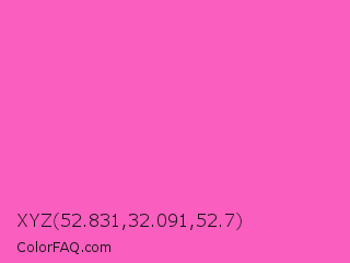 XYZ 52.831,32.091,52.7 Color is a light magenta color and the nearest color is Light Deep Pink #ff5ccd. Hex code #fa5ebf and RGB value is rgb(250,94,191). In RGB color space, this color is composed of 98% red, 37% green, 75% blue, In CMYK color space, this color is composed of 0% cyan, 62% magenta, 24% yellow , 2% black , In HSL color space, this color has a hue angle of 323° , 94% saturation and 67% lightness.