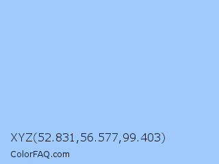 XYZ 52.831,56.577,99.403 Color is a light blue color and the nearest color is Baby Blue Eyes #a1caf1. Hex code #9fcafb and RGB value is rgb(159,202,251). In RGB color space, this color is composed of 62% red, 79% green, 98% blue, In CMYK color space, this color is composed of 37% cyan, 20% magenta, 0% yellow , 2% black , In HSL color space, this color has a hue angle of 212° , 92% saturation and 80% lightness.