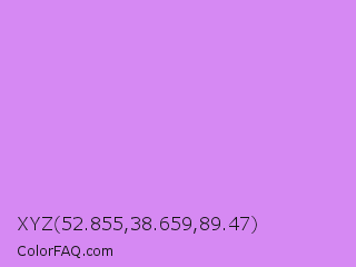 XYZ 52.855,38.659,89.47 Color is a light purple color and the nearest color is Bright Lilac #d891ef. Hex code #d689f3 and RGB value is rgb(214,137,243). In RGB color space, this color is composed of 84% red, 54% green, 95% blue, In CMYK color space, this color is composed of 12% cyan, 44% magenta, 0% yellow , 5% black , In HSL color space, this color has a hue angle of 284° , 82% saturation and 75% lightness.
