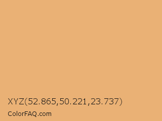 XYZ 52.865,50.221,23.737 Color is a light orange color and the nearest color is Middle Yellow Red #ecb176. Hex code #eab175 and RGB value is rgb(234,177,117). In RGB color space, this color is composed of 92% red, 69% green, 46% blue, In CMYK color space, this color is composed of 0% cyan, 24% magenta, 50% yellow , 8% black , In HSL color space, this color has a hue angle of 31° , 74% saturation and 69% lightness.