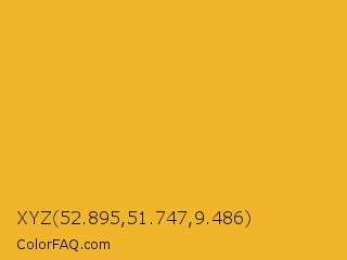 XYZ 52.895,51.747,9.486 Color is a normal orange color and the nearest color is Fuel Yellow #eca927. Hex code #f0b52b and RGB value is rgb(240,181,43). In RGB color space, this color is composed of 94% red, 71% green, 17% blue, In CMYK color space, this color is composed of 0% cyan, 25% magenta, 82% yellow , 6% black , In HSL color space, this color has a hue angle of 42° , 87% saturation and 55% lightness.