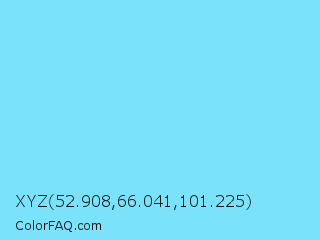 XYZ 52.908,66.041,101.225 Color is a light cyan color and the nearest color is Spray #79deec. Hex code #7ae3fb and RGB value is rgb(122,227,251). In RGB color space, this color is composed of 48% red, 89% green, 98% blue, In CMYK color space, this color is composed of 51% cyan, 10% magenta, 0% yellow , 2% black , In HSL color space, this color has a hue angle of 191° , 94% saturation and 73% lightness.