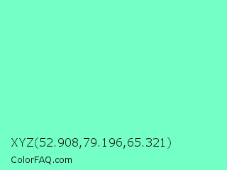 XYZ 52.908,79.196,65.321 Color is a light green color and the nearest color is Aquamarine #7fffd4. Hex code #73ffc5 and RGB value is rgb(115,255,197). In RGB color space, this color is composed of 45% red, 100% green, 77% blue, In CMYK color space, this color is composed of 55% cyan, 0% magenta, 23% yellow , 0% black , In HSL color space, this color has a hue angle of 155° , 100% saturation and 73% lightness.