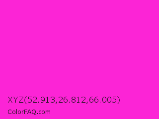 XYZ 52.913,26.812,66.005 Color is a normal magenta color and the nearest color is Hot Magenta #ff1dce. Hex code #fc24d6 and RGB value is rgb(252,36,214). In RGB color space, this color is composed of 99% red, 14% green, 84% blue, In CMYK color space, this color is composed of 0% cyan, 86% magenta, 15% yellow , 1% black , In HSL color space, this color has a hue angle of 311° , 97% saturation and 56% lightness.