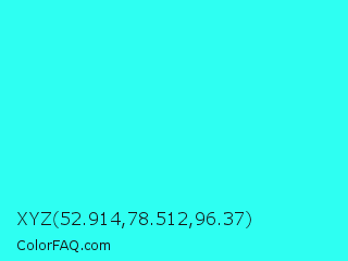 XYZ 52.914,78.512,96.37 Color is a normal cyan color and the nearest color is Loeen #15f2fd. Hex code #2efff2 and RGB value is rgb(46,255,242). In RGB color space, this color is composed of 18% red, 100% green, 95% blue, In CMYK color space, this color is composed of 82% cyan, 0% magenta, 5% yellow , 0% black , In HSL color space, this color has a hue angle of 176° , 100% saturation and 59% lightness.
