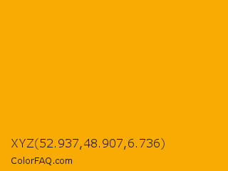 XYZ 52.937,48.907,6.736 Color is a normal orange color and the nearest color is Yellow Sea #fea904. Hex code #f7ab03 and RGB value is rgb(247,171,3). In RGB color space, this color is composed of 97% red, 67% green, 1% blue, In CMYK color space, this color is composed of 0% cyan, 31% magenta, 99% yellow , 3% black , In HSL color space, this color has a hue angle of 41° , 98% saturation and 49% lightness.