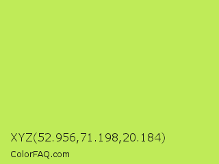 XYZ 52.956,71.198,20.184 Color is a light lime color and the nearest color is Inchworm #b2ec5d. Hex code #bfeb58 and RGB value is rgb(191,235,88). In RGB color space, this color is composed of 75% red, 92% green, 35% blue, In CMYK color space, this color is composed of 19% cyan, 0% magenta, 63% yellow , 8% black , In HSL color space, this color has a hue angle of 78° , 79% saturation and 63% lightness.