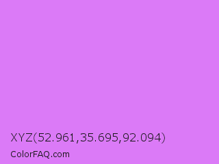 XYZ 52.961,35.695,92.094 Color is a light purple color and the nearest color is Heliotrope #df73ff. Hex code #db7af7 and RGB value is rgb(219,122,247). In RGB color space, this color is composed of 86% red, 48% green, 97% blue, In CMYK color space, this color is composed of 11% cyan, 51% magenta, 0% yellow , 3% black , In HSL color space, this color has a hue angle of 287° , 89% saturation and 72% lightness.