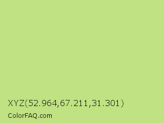XYZ 52.964,67.211,31.301 Color is a light green color and the nearest color is Yellow Green #c5e17a. Hex code #c0e282 and RGB value is rgb(192,226,130). In RGB color space, this color is composed of 75% red, 89% green, 51% blue, In CMYK color space, this color is composed of 15% cyan, 0% magenta, 42% yellow , 11% black , In HSL color space, this color has a hue angle of 81° , 62% saturation and 70% lightness.