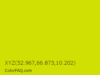 XYZ 52.967,66.873,10.202 Color is a normal yellow color and the nearest color is Bitter Lemon #cae00d. Hex code #d1e003 and RGB value is rgb(209,224,3). In RGB color space, this color is composed of 82% red, 88% green, 1% blue, In CMYK color space, this color is composed of 7% cyan, 0% magenta, 99% yellow , 12% black , In HSL color space, this color has a hue angle of 64° , 97% saturation and 45% lightness.