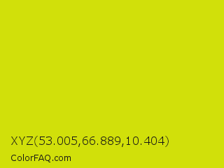 XYZ 53.005,66.889,10.404 Color is a normal yellow color and the nearest color is Bitter Lemon #cae00d. Hex code #d1e00a and RGB value is rgb(209,224,10). In RGB color space, this color is composed of 82% red, 88% green, 4% blue, In CMYK color space, this color is composed of 7% cyan, 0% magenta, 96% yellow , 12% black , In HSL color space, this color has a hue angle of 64° , 91% saturation and 46% lightness.