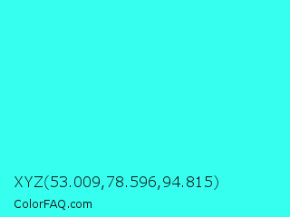 XYZ 53.009,78.596,94.815 Color is a light cyan color and the nearest color is Loeen #15f2fd. Hex code #36fff0 and RGB value is rgb(54,255,240). In RGB color space, this color is composed of 21% red, 100% green, 94% blue, In CMYK color space, this color is composed of 79% cyan, 0% magenta, 6% yellow , 0% black , In HSL color space, this color has a hue angle of 176° , 100% saturation and 61% lightness.
