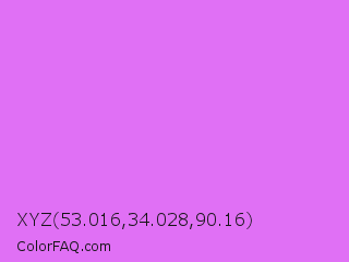 XYZ 53.016,34.028,90.16 Color is a light purple color and the nearest color is Heliotrope #df73ff. Hex code #e070f5 and RGB value is rgb(224,112,245). In RGB color space, this color is composed of 88% red, 44% green, 96% blue, In CMYK color space, this color is composed of 9% cyan, 54% magenta, 0% yellow , 4% black , In HSL color space, this color has a hue angle of 291° , 87% saturation and 70% lightness.