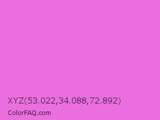 XYZ 53.022,34.088,72.892 Color is a light magenta color and the nearest color is Orchid #da70d6. Hex code #eb6ede and RGB value is rgb(235,110,222). In RGB color space, this color is composed of 92% red, 43% green, 87% blue, In CMYK color space, this color is composed of 0% cyan, 53% magenta, 6% yellow , 8% black , In HSL color space, this color has a hue angle of 306° , 76% saturation and 68% lightness.