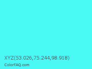 XYZ 53.026,75.244,98.918 Color is a light cyan color and the nearest color is Turquoise #40e0d0. Hex code #4af8f6 and RGB value is rgb(74,248,246). In RGB color space, this color is composed of 29% red, 97% green, 96% blue, In CMYK color space, this color is composed of 70% cyan, 0% magenta, 1% yellow , 3% black , In HSL color space, this color has a hue angle of 179° , 93% saturation and 63% lightness.