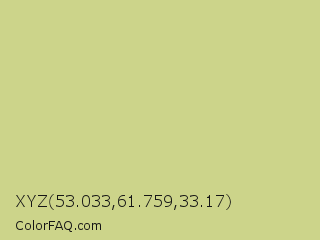 XYZ 53.033,61.759,33.17 Color is a light yellow color and the nearest color is Medium Spring Bud #c9dc87. Hex code #ccd48a and RGB value is rgb(204,212,138). In RGB color space, this color is composed of 80% red, 83% green, 54% blue, In CMYK color space, this color is composed of 4% cyan, 0% magenta, 35% yellow , 17% black , In HSL color space, this color has a hue angle of 66° , 46% saturation and 69% lightness.