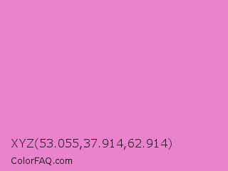 XYZ 53.055,37.914,62.914 Color is a light magenta color and the nearest color is Persian Pink #f77fbe. Hex code #ea82ce and RGB value is rgb(234,130,206). In RGB color space, this color is composed of 92% red, 51% green, 81% blue, In CMYK color space, this color is composed of 0% cyan, 44% magenta, 12% yellow , 8% black , In HSL color space, this color has a hue angle of 316° , 71% saturation and 71% lightness.