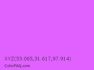 XYZ 53.065,31.617,97.914 Color is a light purple color and the nearest color is Heliotrope #df73ff. Hex code #e061ff and RGB value is rgb(224,97,255). In RGB color space, this color is composed of 88% red, 38% green, 100% blue, In CMYK color space, this color is composed of 12% cyan, 62% magenta, 0% yellow , 0% black , In HSL color space, this color has a hue angle of 288° , 100% saturation and 69% lightness.