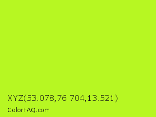 XYZ 53.078,76.704,13.521 Color is a normal lime color and the nearest color is Green Yellow #adff2f. Hex code #b7f722 and RGB value is rgb(183,247,34). In RGB color space, this color is composed of 72% red, 97% green, 13% blue, In CMYK color space, this color is composed of 26% cyan, 0% magenta, 86% yellow , 3% black , In HSL color space, this color has a hue angle of 78° , 93% saturation and 55% lightness.