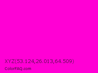 XYZ 53.124,26.013,64.509 Color is a normal magenta color and the nearest color is Purple Pizzazz #ff00cc. Hex code #ff00d4 and RGB value is rgb(255,0,212). In RGB color space, this color is composed of 100% red, 0% green, 83% blue, In CMYK color space, this color is composed of 0% cyan, 100% magenta, 17% yellow , 0% black , In HSL color space, this color has a hue angle of 310° , 100% saturation and 50% lightness.