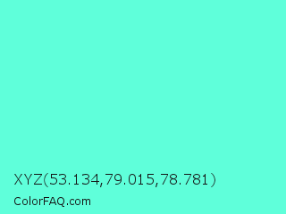 XYZ 53.134,79.015,78.781 Color is a light cyan color and the nearest color is Aquamarine #7fffd4. Hex code #5fffda and RGB value is rgb(95,255,218). In RGB color space, this color is composed of 37% red, 100% green, 85% blue, In CMYK color space, this color is composed of 63% cyan, 0% magenta, 15% yellow , 0% black , In HSL color space, this color has a hue angle of 166° , 100% saturation and 69% lightness.