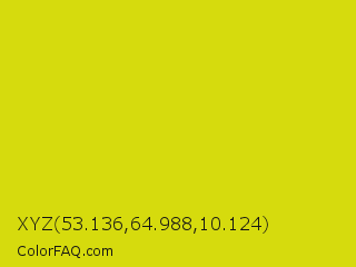 XYZ 53.136,64.988,10.124 Color is a normal yellow color and the nearest color is Bitter Lemon #cae00d. Hex code #d6db0d and RGB value is rgb(214,219,13). In RGB color space, this color is composed of 84% red, 86% green, 5% blue, In CMYK color space, this color is composed of 2% cyan, 0% magenta, 94% yellow , 14% black , In HSL color space, this color has a hue angle of 61° , 89% saturation and 45% lightness.