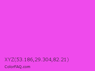 XYZ 53.186,29.304,82.21 Color is a light magenta color and the nearest color is Purple Pizzazz #fe4eda. Hex code #ef4aec and RGB value is rgb(239,74,236). In RGB color space, this color is composed of 94% red, 29% green, 93% blue, In CMYK color space, this color is composed of 0% cyan, 69% magenta, 1% yellow , 6% black , In HSL color space, this color has a hue angle of 301° , 84% saturation and 61% lightness.